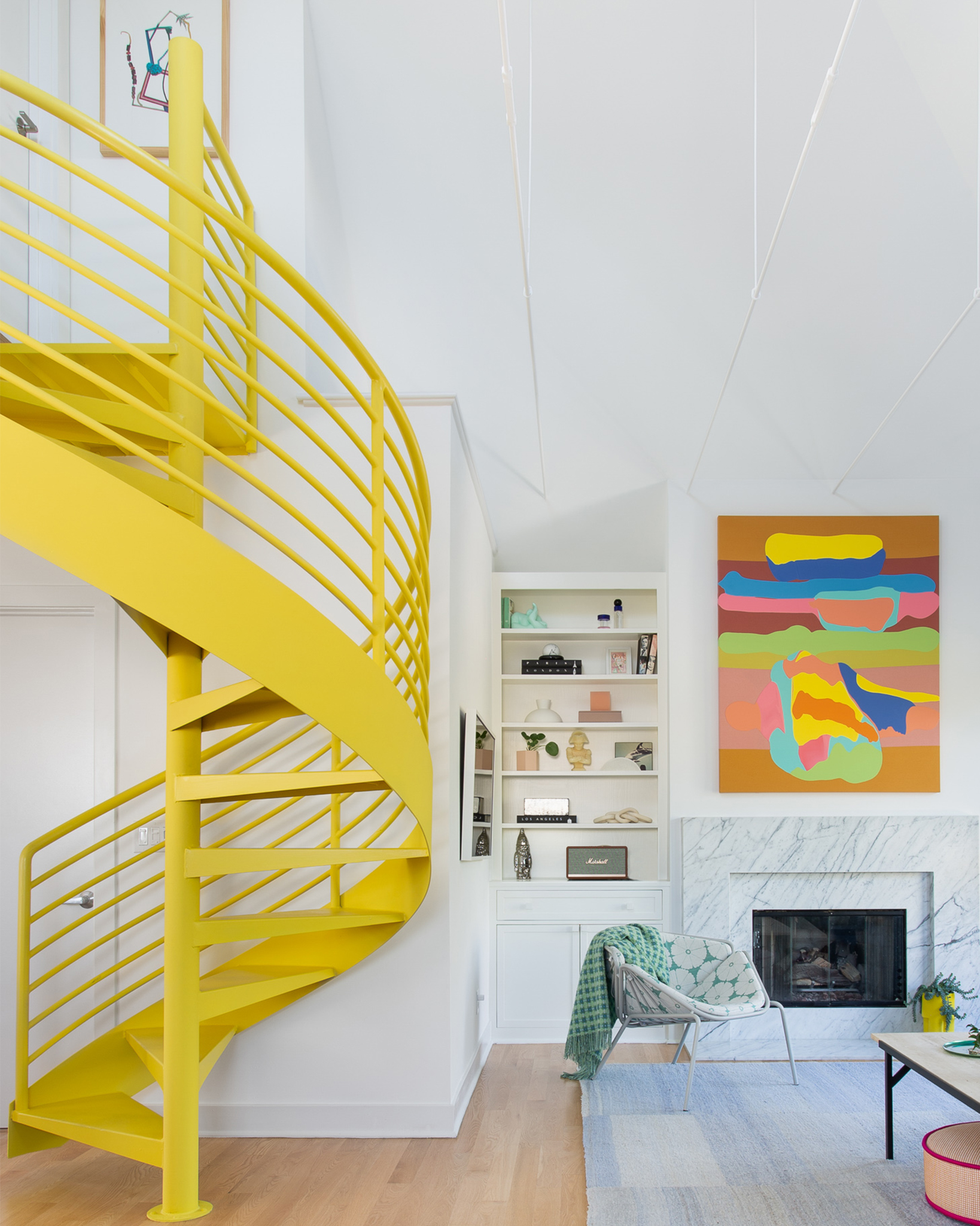 The existing spiral staircase leading to the Primary Bedroom on the second floor was painted a sunny yellow to make it a sculptural focal point and to complement the painting over the fireplace. To ground the bright colors, we incorporated a range of subtle textures and organic elements such as the travertine surface of the coffee table and the soft woven grey-blue rug.